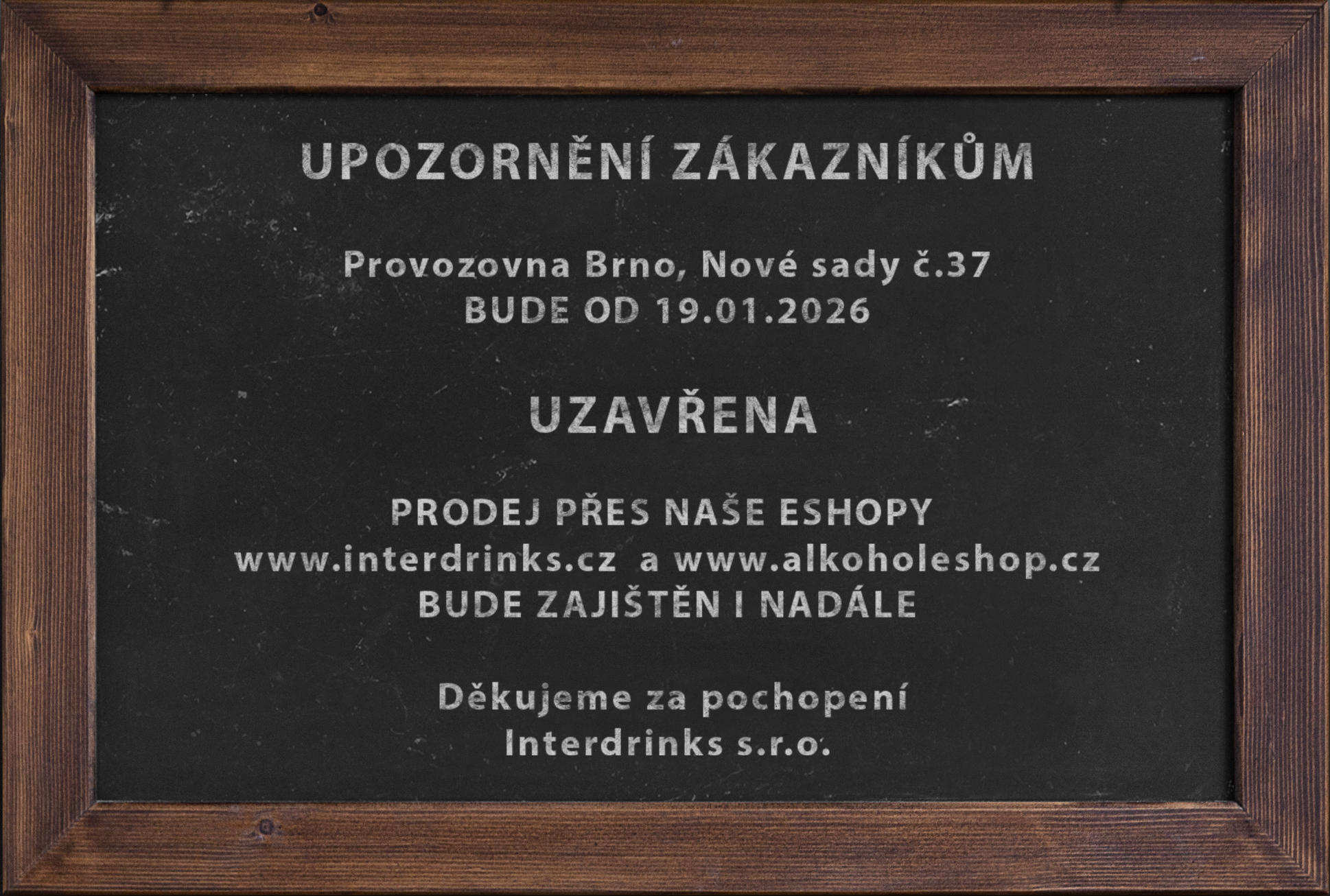 • Před odesláním první objednávky se prosím zaregistrujte! Bez řádné registrace není bohužel možné Vaši objednávku přijmout. Firma Interdrinks si vyhrazuje právo v případě pochybností o plnoletosti registrovaného zákazníka zaslat objednané zboží kurýrní službou, která bude oprávněna ověřit věk příjemce při dodání.Souhlasem s uvedenými obchodními podmínkami a následným nákupem v internetovém obchodě www.interdrinks.cz zákazník potvrzuje, že dovršil věku 18 let.