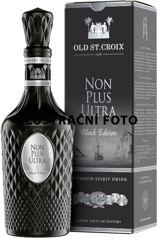 Old St. Croix Non Plus Ultra Black je exkluzivní a mimořádně luxusní rum, který vyniká svou temnou elegancí a hlubokým, komplexním charakterem. Jeho barva se pohybuje od zlaté až po mahagonovou, což odráží dlouhé zrání a použití speciálních sudů.