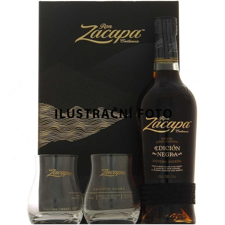 ZACAPA EDICION NEGRA + SKLO 43%0,7l(kartZacapa Edoción Negra 23 je destilován z fermentovaného čistého panenského sirupu cukrové třtiny. Zraje systémem Solera v nadmořské výšce 2.333 metrů v sudech z amerických bílích dubů, ve kterých zrál dříve Bourbon ( zákon o výrobě Bourbonu připouští dubové sudy použít pouze jednou na příslušný proces staření ) a Sherry Pedro Ximenez. Tento rum je navíc na dva roky ukládán do sudů z francouzských dubů, ve kterých byl dříve uložen cognac. Ron Zacapa Etiqueta Negra 23 je vyráběn z těch nejpečlivěji vybíraných rumů o průměrném stáří 6 let.Tyto 6 a 23 leté rumy jsou následně pečlivě míchány a ještě jednou již smíchné stařeny 1 - 2 roky taktéž v dubových sudech. Ron Zacapa Etiqueta Negra 23 má obsah alkoholu 43% a od Ron Zacapa Centenario 23 se liší v míchání. Počet sudů po Sherry se násobí a proto je tento rum výrazně jemnější. Momentálně k dodání v dárkové tubě zdarma !